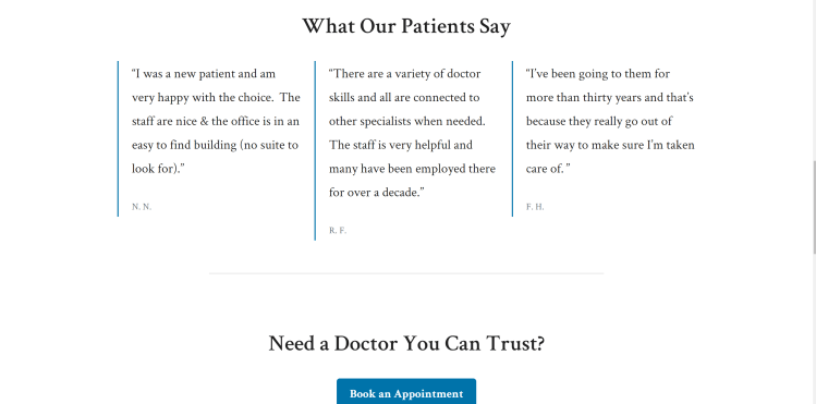- The office’s physical address, the office’s contact information, and links to book appointments with doctors on every single page