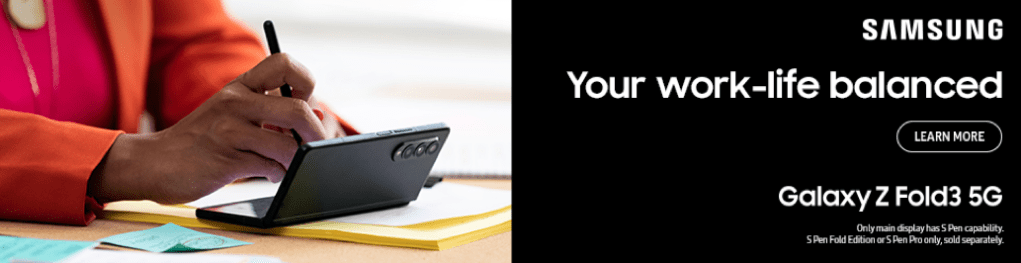 Long Copy: Business never sleeps, and now it doesn’t have to be confined to a desk either. Galaxy Z Fold3 5G comes integrated with Microsoft Office, OneDrive and Teams so you can easily access all your files, photos and reminders —whether you’re in the office, working from home or on the move.