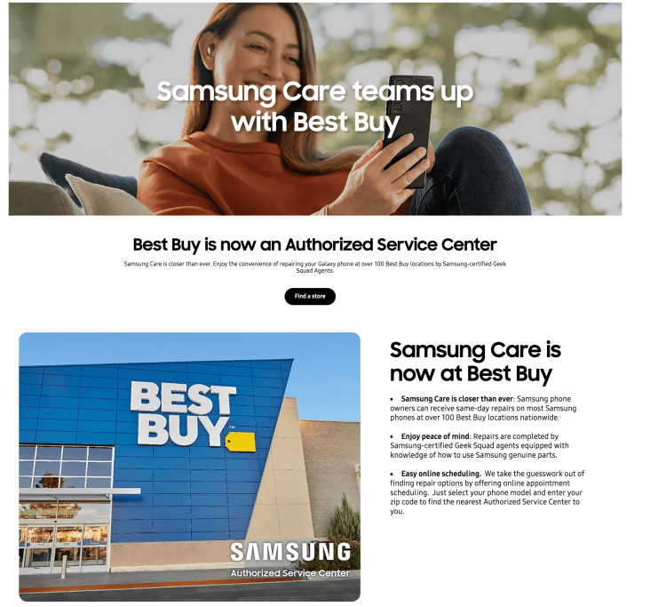 I wrote the copy for a webpage which announces/explains the joint partnership between Samsung Care and Best Buy and how Samsung device owners can receive help from Best Buy’s Geek Squad.