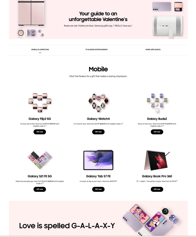 I developed ideas for and wrote copy for the Samsung Valentine’s Day page at https://www.samsung.com/us/gift-ideas/valentines-day/ .